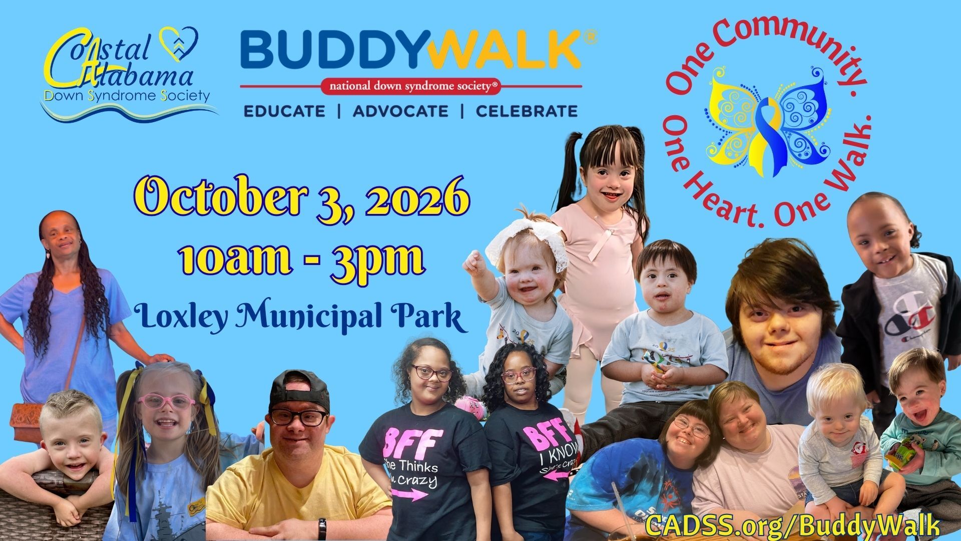 Since 2008, the Coastal Alabama Down Syndrome Society (CADSS) has hosted its annual Buddy Walk, promoting acceptance and inclusion of individuals with Down Syndrome. Our 2026 Buddy Walk will be held Saturday, October 3rd, at the Loxley Municipal Park, from 10am to 3pm. Along with the one-mile walk, our event also features games for all ages, special guests, a DJ, food, and much more. Last year’s walk attracted over 1,000 people!